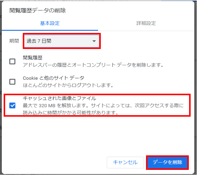 2.期間を選択し、[キャッシュされた画像とファイル]にチェックを入れ、[データを削除]をクリックします。