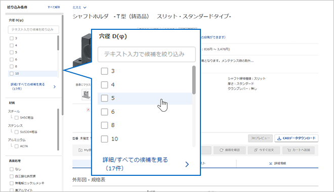 仕様・寸法が確定すると該当の型番が表示され、「CADデータダウンロード」ボタンからCADデータをダウンロードできます。