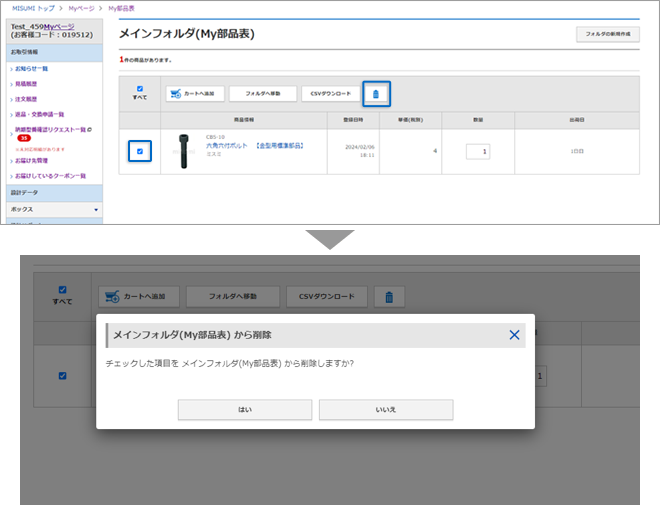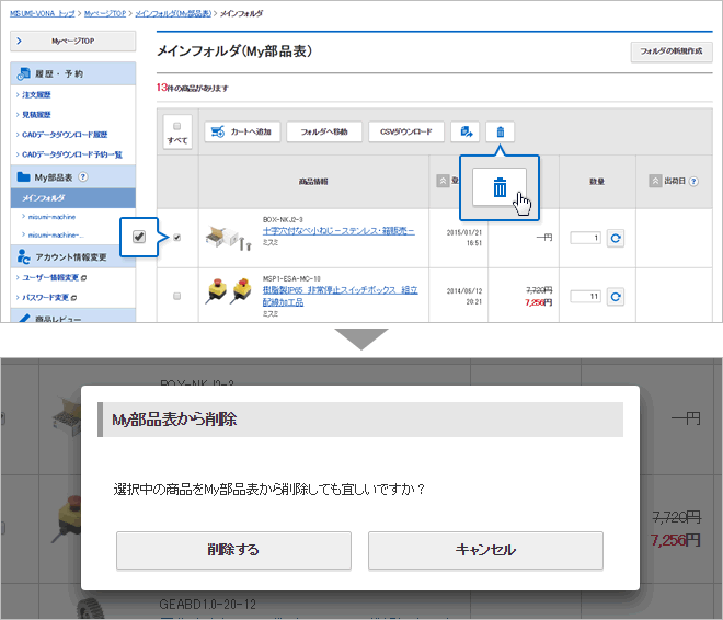 My部品表の中から、削除したいフォルダを選択し、「フォルダを削除」をクリックします。