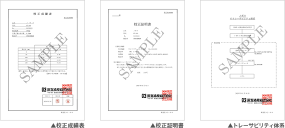 校正成績表、校正証明書、トレーサビリティ体系3点セットです。ISO監査においてはこの3点の文書が必要となります。