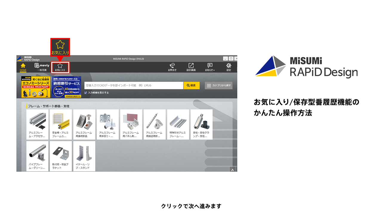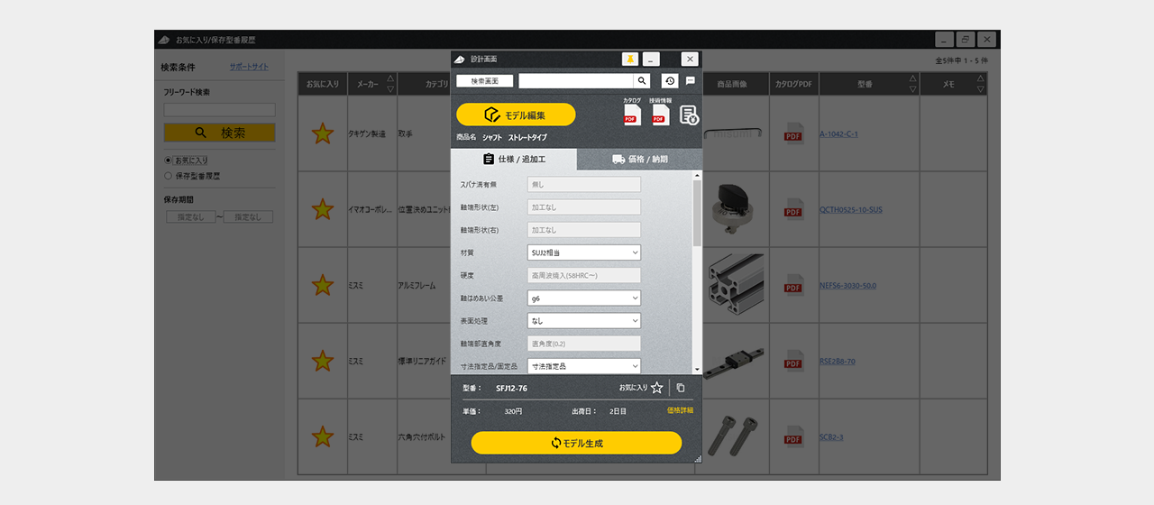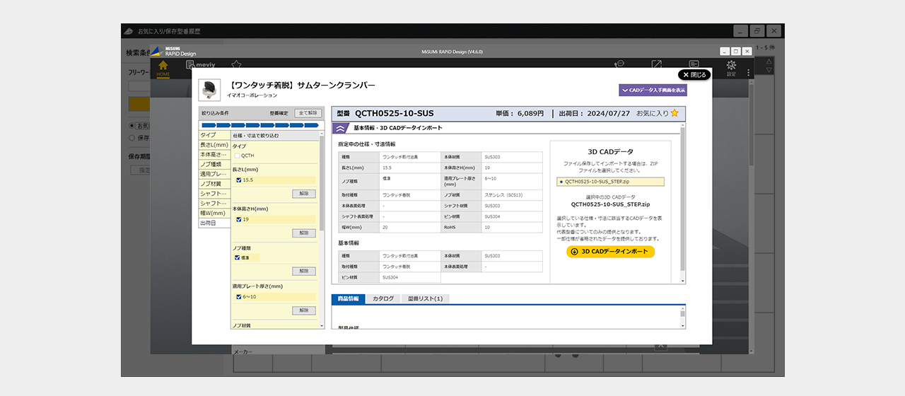 お気に入りと保存型番履歴から CADモデルをインポート可能です
