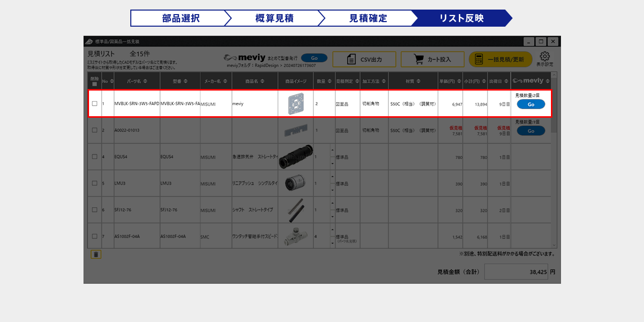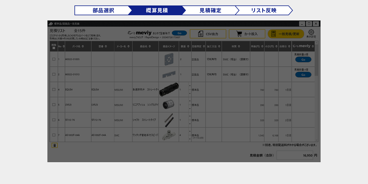 見積リストをCSVファイルで出力と、ミスミサイトの注文画面にカート投入も可能