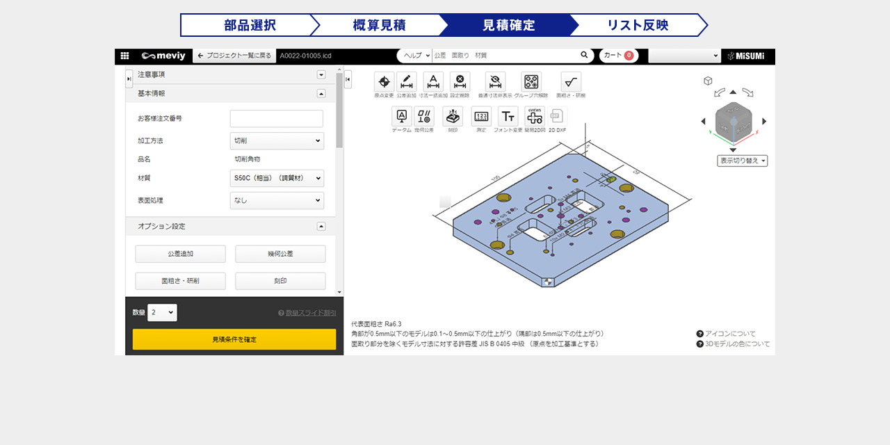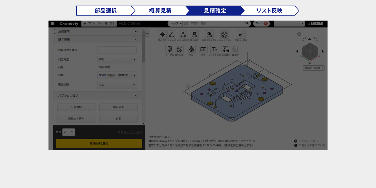 meviyのページへ遷移し、仕様を選択して見積条件を確定ボタンをクリック