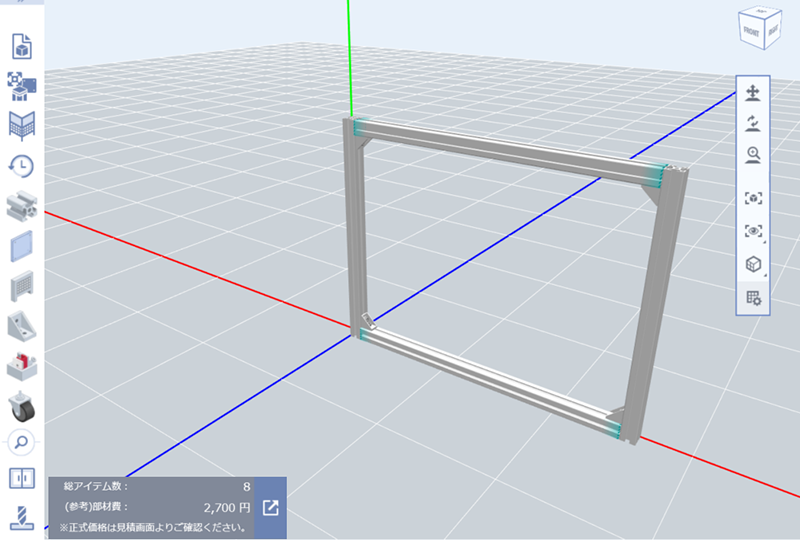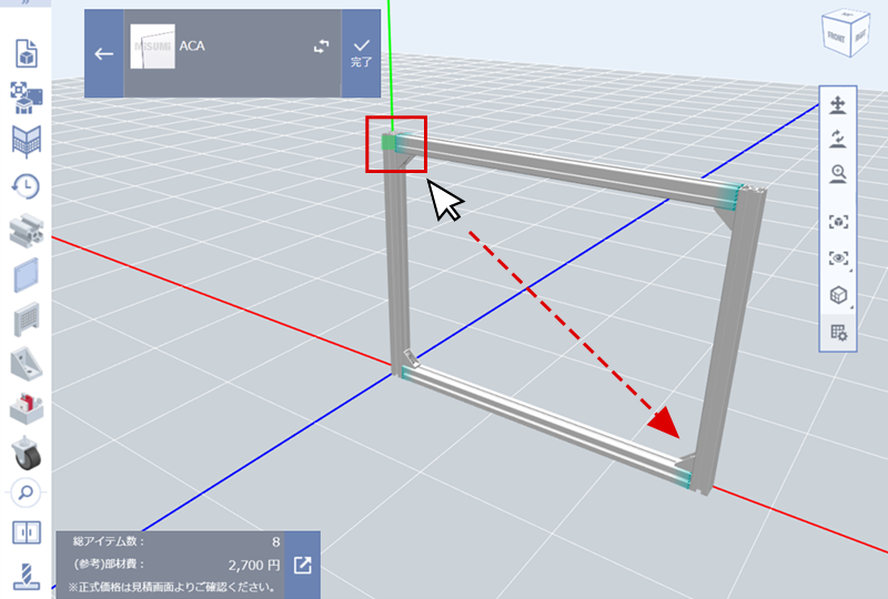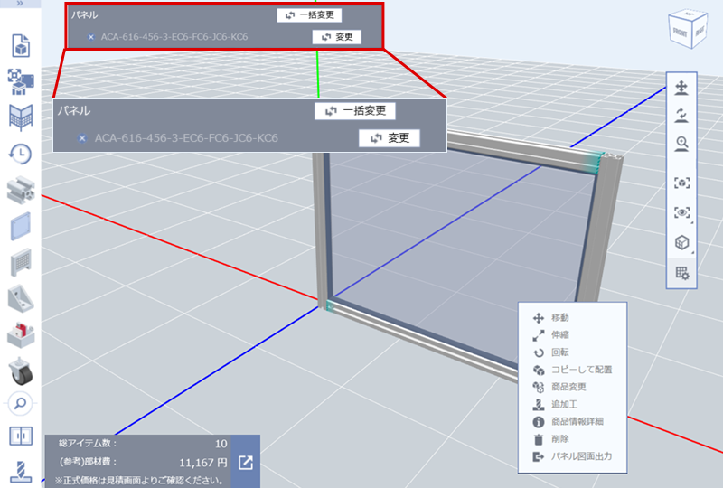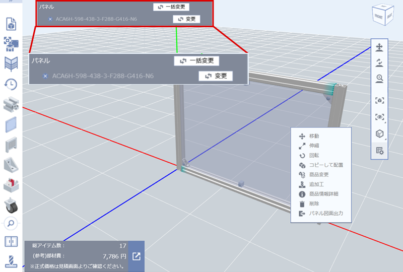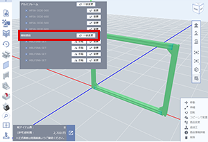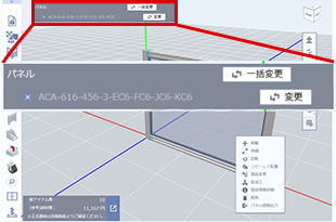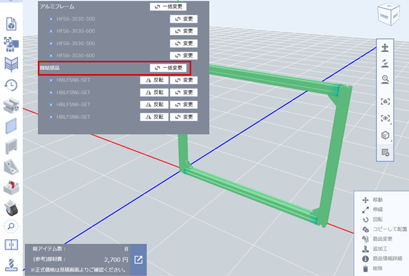 (2)挿入するアルミフレームの枠すべてを選択し、アルミフレームの締結部品を変更する