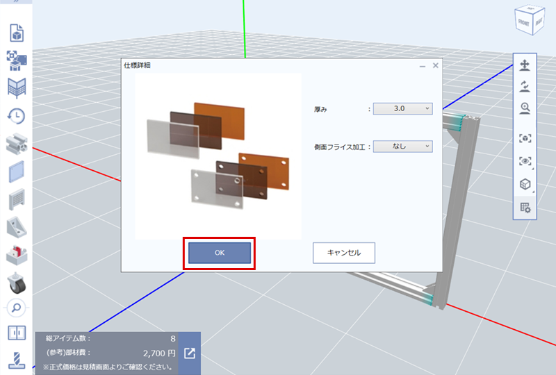 (6)仕様詳細(パネルの厚み、側面加工)を確認して「OK」