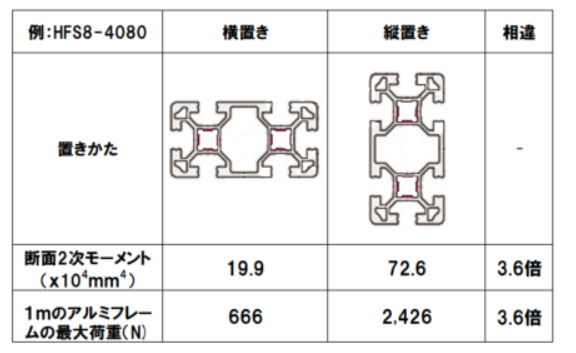 長方形のアルミフレームの場合、縦に起きた方が最大荷重が大きくなります。